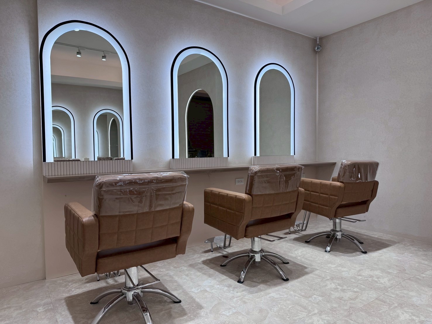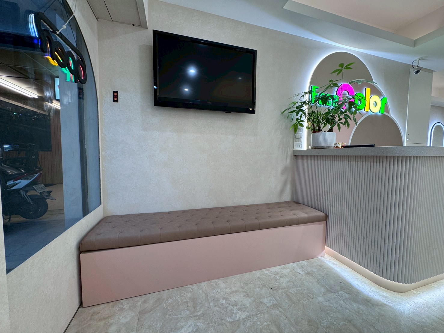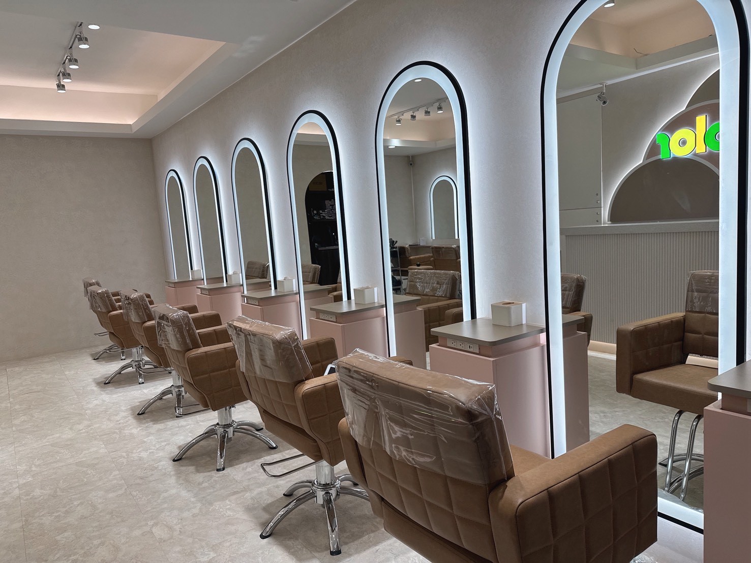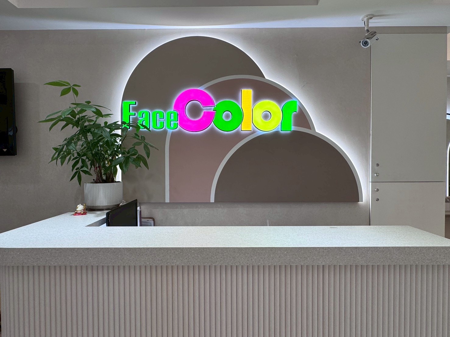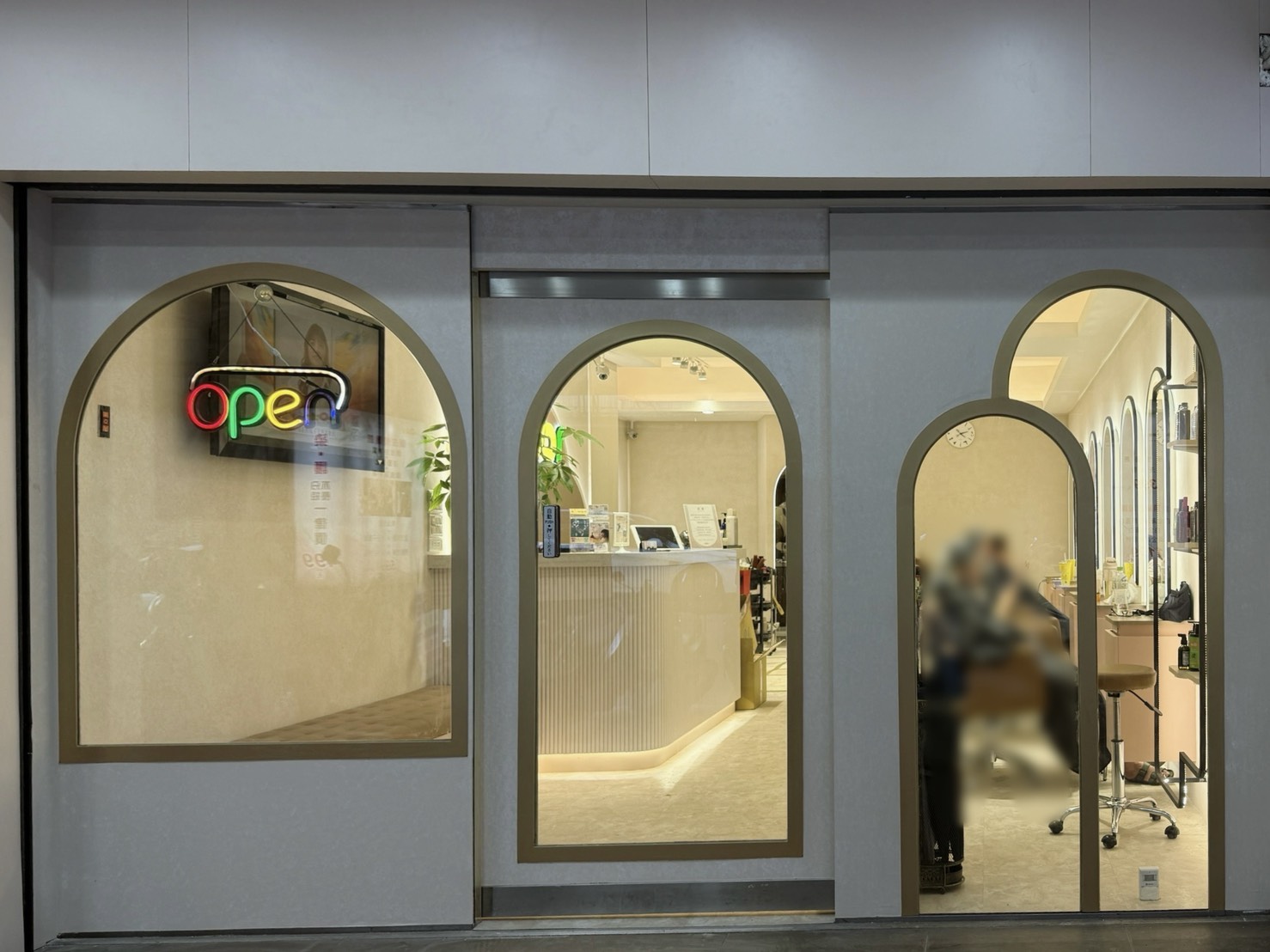 📍門口圓潤的拱門設計搭配精緻的金色邊框,營造出一種優雅、溫馨且具設計感的氛圍,在門外就能感受到FaceColor的專業與品味。