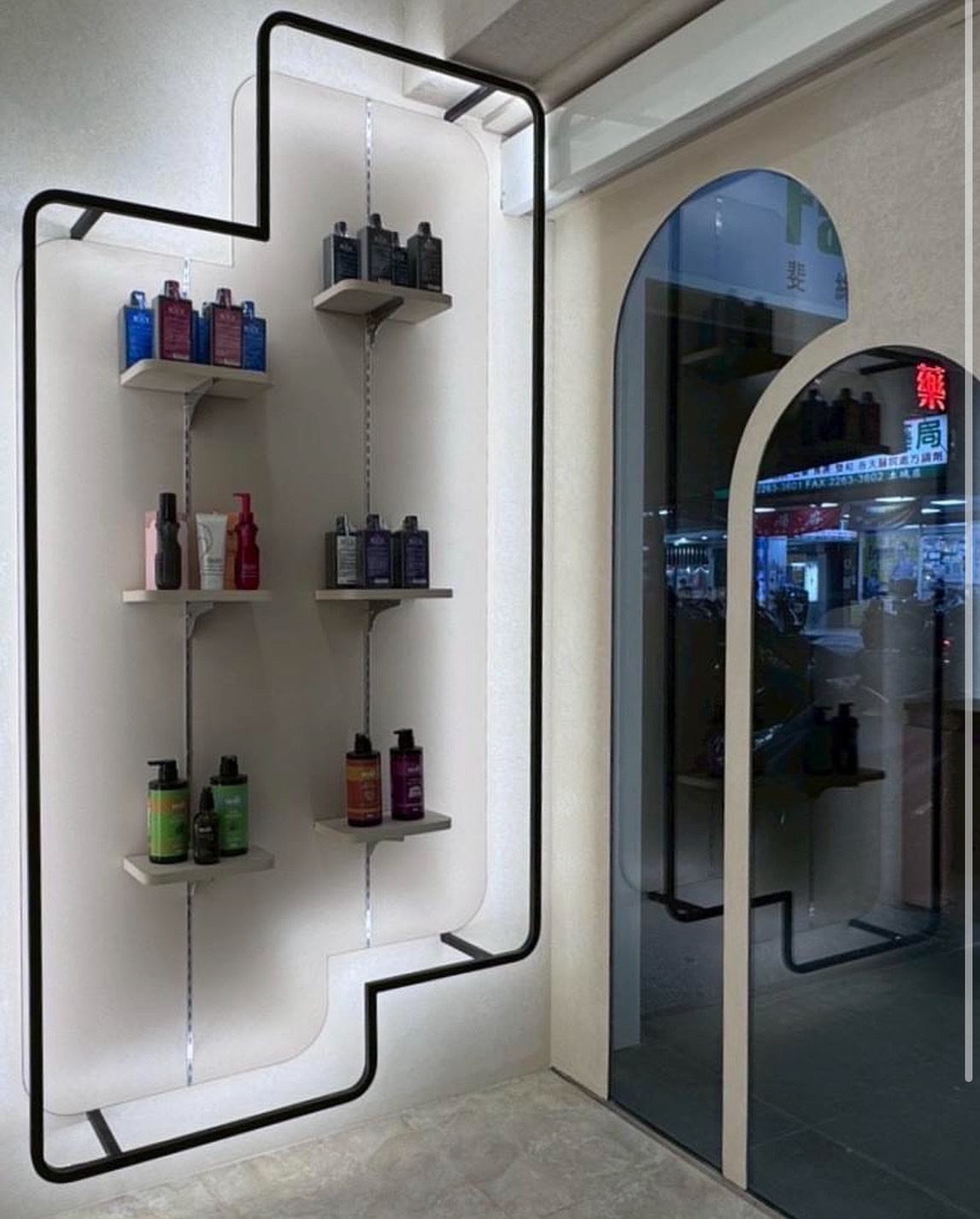 充滿現代感的幾何造型展示架,搭配內嵌的柔和背光燈條,讓每一瓶髮品都成為藝術品。