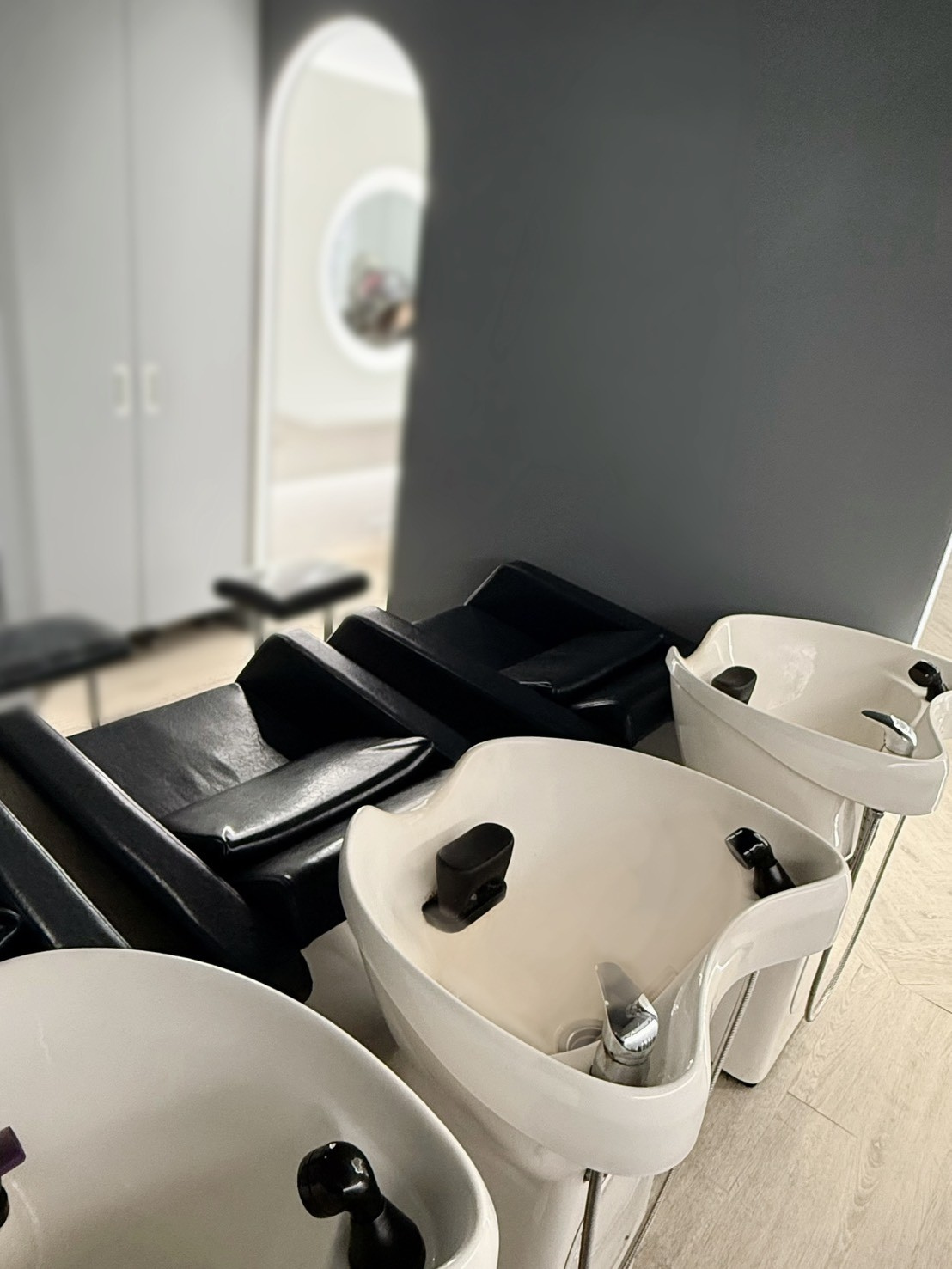 洗髮區被巧妙隱藏於店內後方,透過拱門通道進入,營造出隔絕喧囂的神祕感。