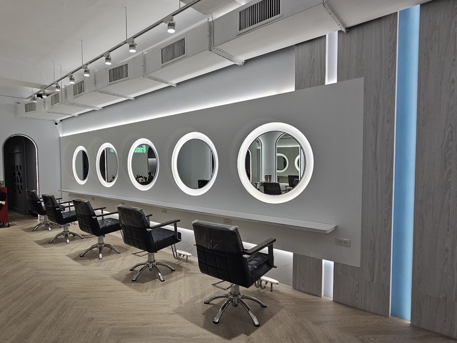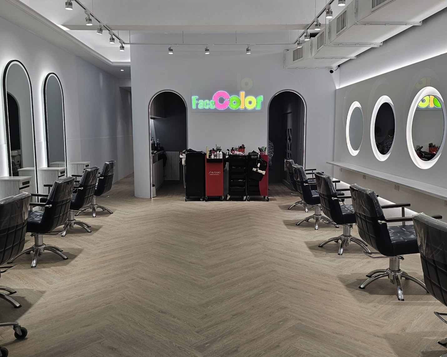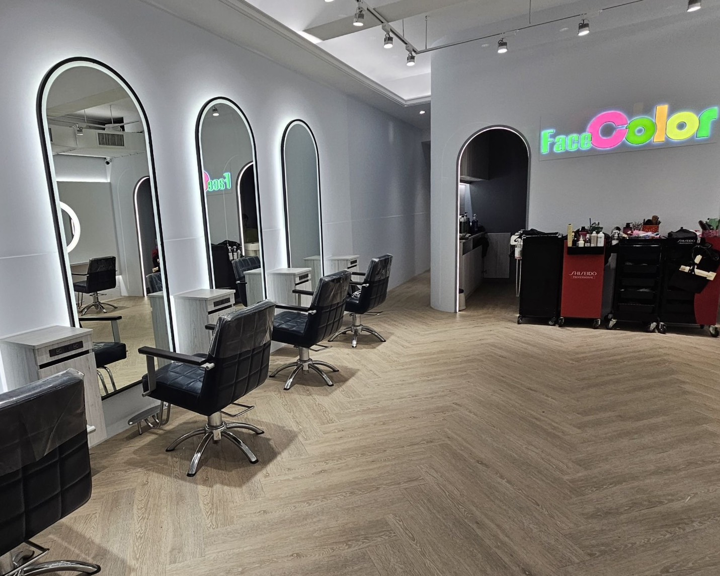 整個造型區採用魚骨拼木地板,搭配簡約白更顯乾淨,動線寬敞流暢,讓客戶與髮型設計師都能在舒適的空間中,更專注色彩與造型的藝術!
