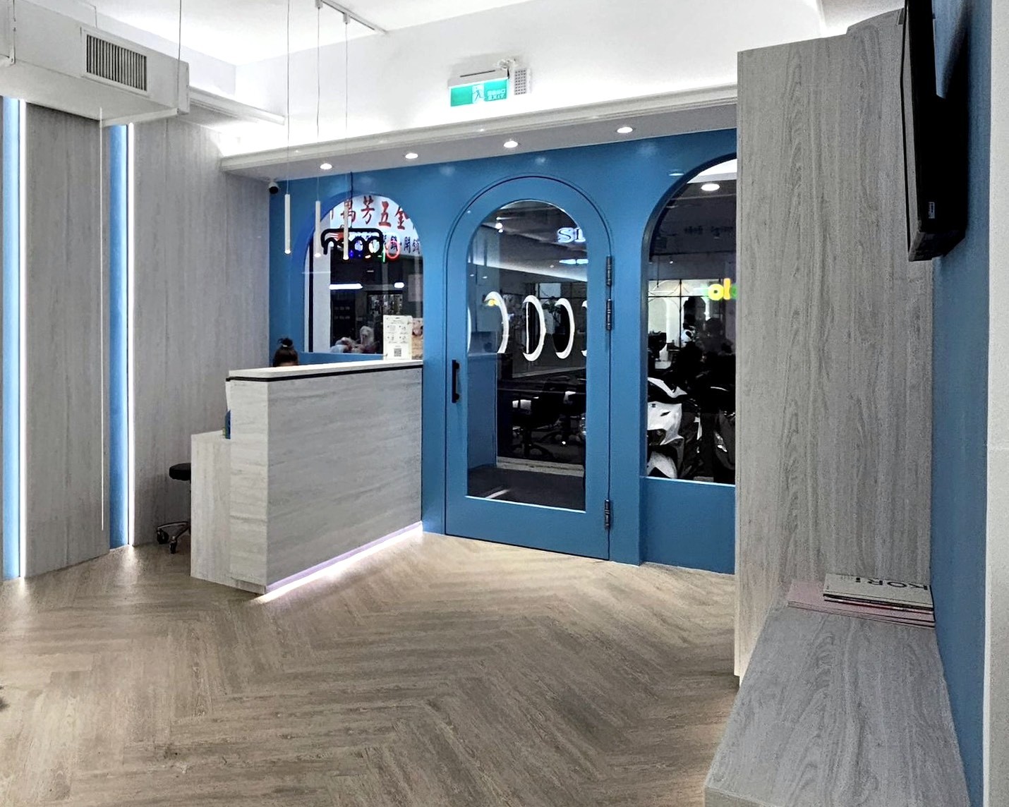 淺色木紋與時尚藍調組成的極簡櫃檯,顯得俐落大方,櫃台後方結合柔和光帶,可以感受到專業且充滿設計感的接待氛圍。