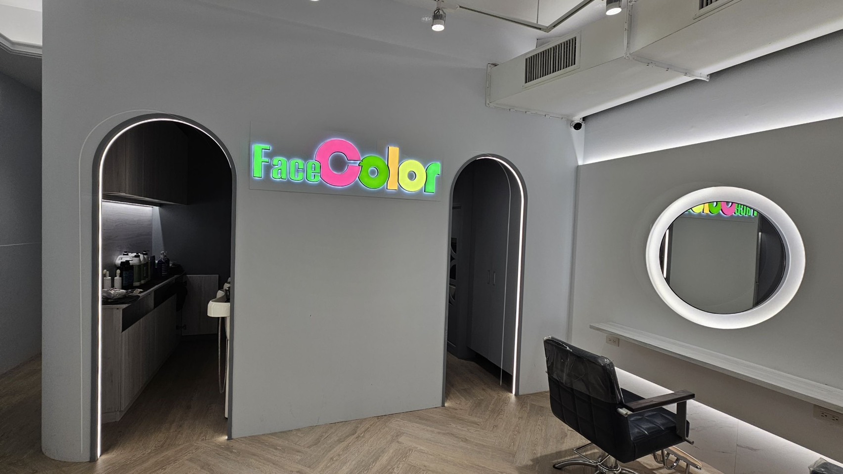 延續門面的拱門造型鏡,搭配立體環繞的柔光燈帶,確保光線均勻,讓您美感加倍。