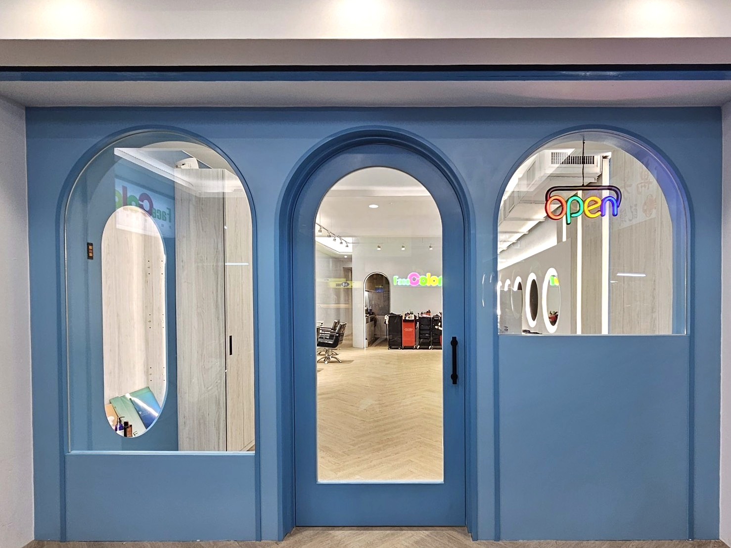 FaceColor 信義松山店正式開幕!我們將空間設計昇華至另一個層次,以時尚藍調搭配簡約白的純粹,打造出一個充滿現代設計感的美髮新地標!